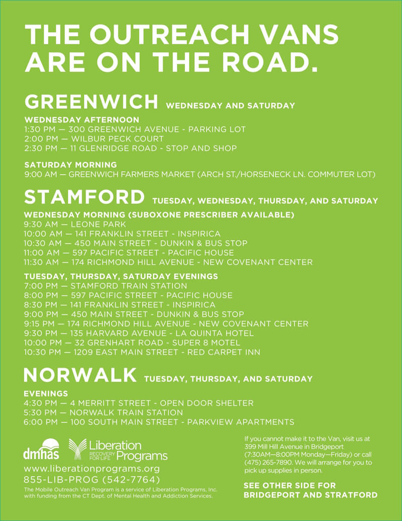 Liberation Programs’ two Outreach Vans provide various services to adults 18 years and older with substance misuse and mental health disorders. The Vans travel throughout Lower Fairfield County 7 days a week according to the schedule below and are available on call. Insurance and appointments are not required.
